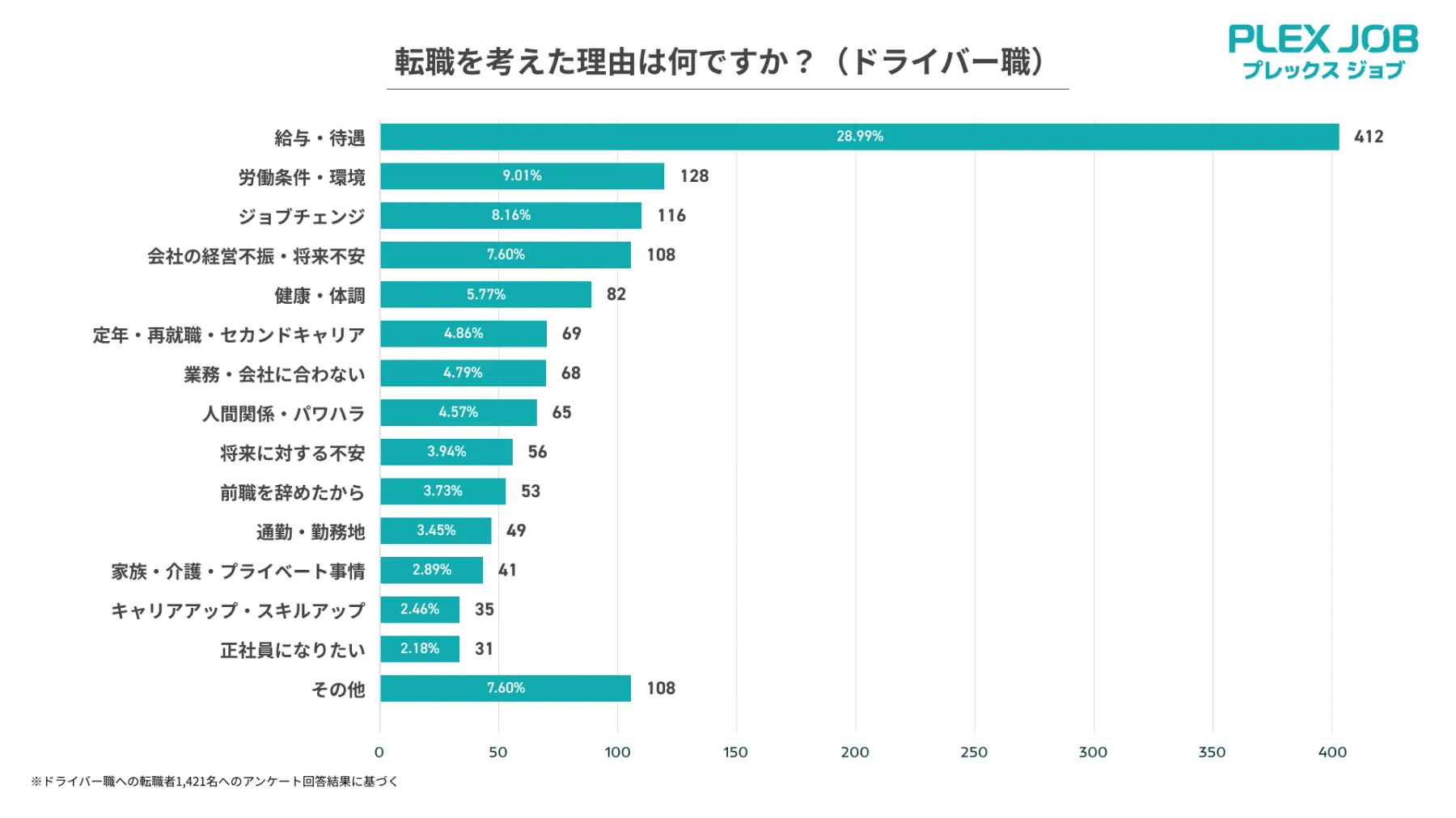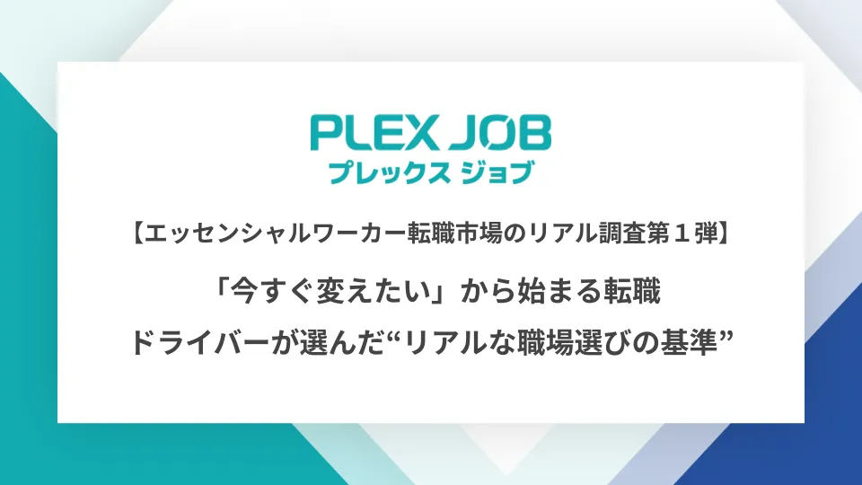 運送|建設|技術職の求人サイト「プレックスジョブ(https://www.plex-job.com/)」を運営する株式会社プレックス(本社:東京都中央区、代表取締役社長:黒﨑 俊、以下当社)は、プレックスジョブ経由で転職した1,620名(内訳:ドライバー職 1,421名 +施工管理・電気設備管理職 199名)にアンケートを実施し、エッセンシャルワーカー転職市場の実態を調査・分析しました。本リリースでは、ドライバー職における転職のリアルな実態をご紹介します。