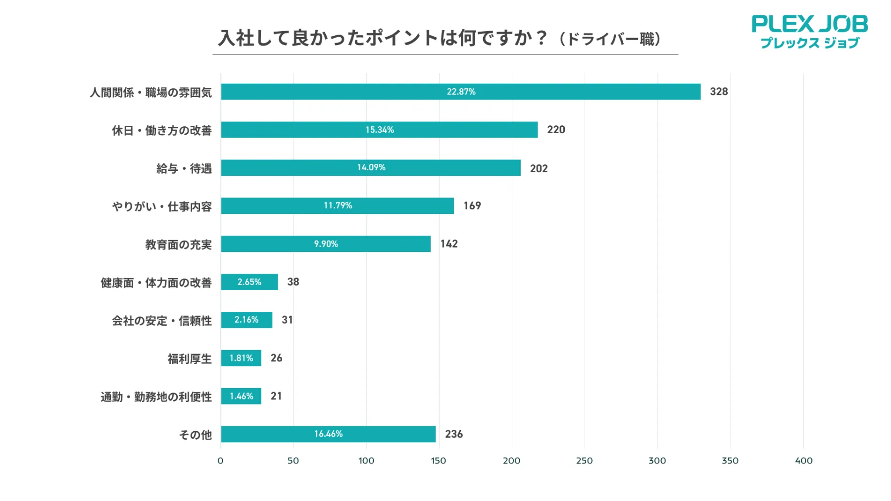 入社後に「転職して良かった」と感じた点については、「人間関係・職場の雰囲気」が全体の23%で最も多く、転職理由/入社の決め手とは異なり、ひとりで働く時間が長いドライバー職でも、職場の雰囲気や社員同士のフォロー体制など、働きやすさを重視する傾向が伺えます。