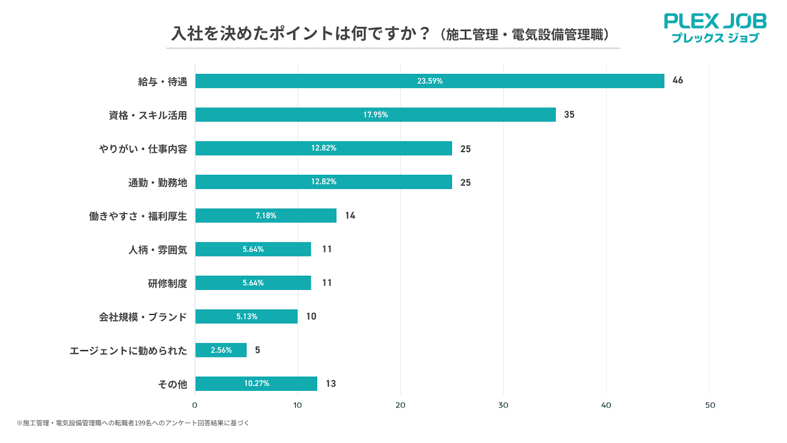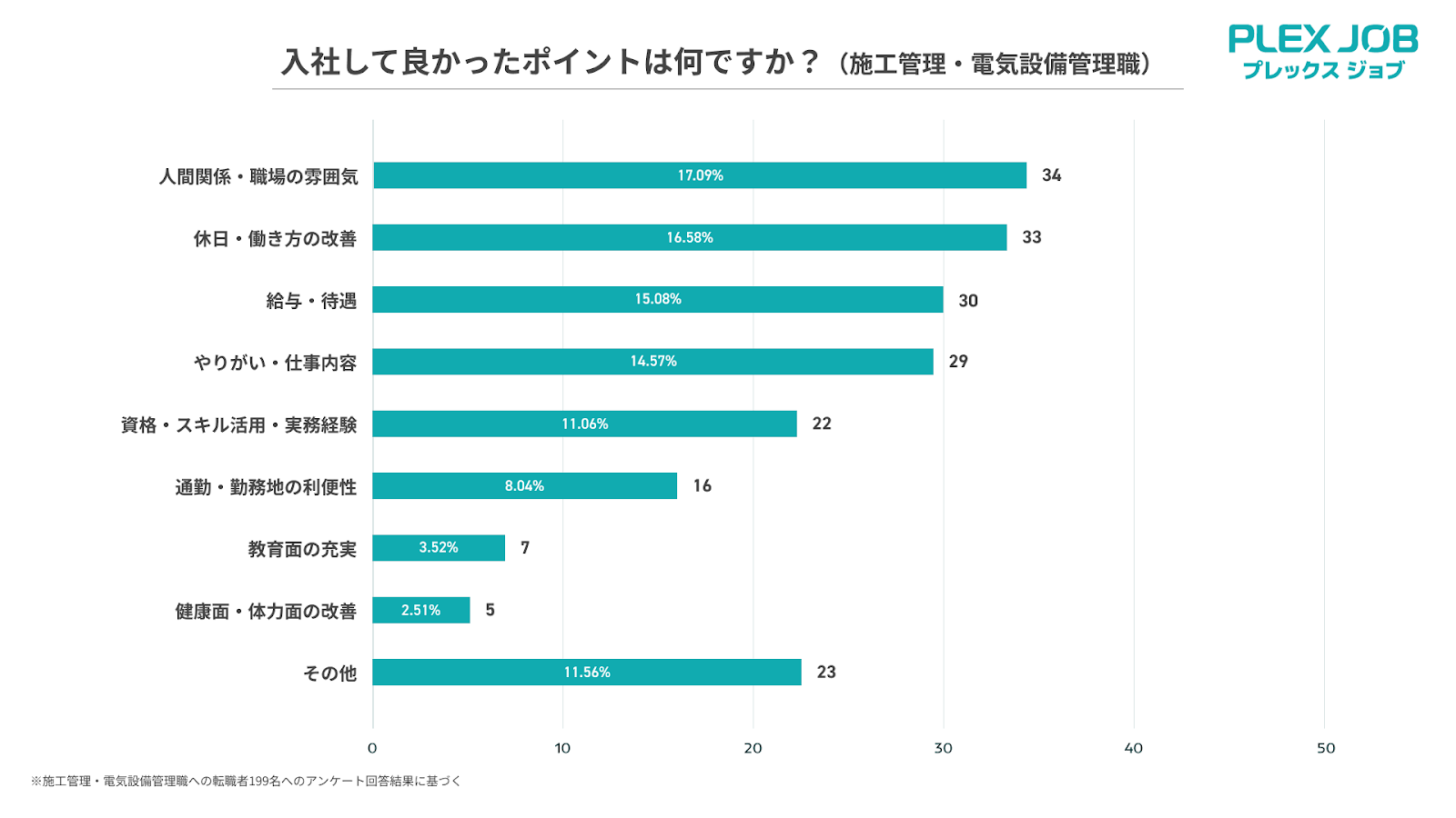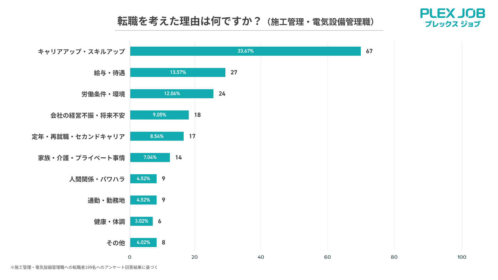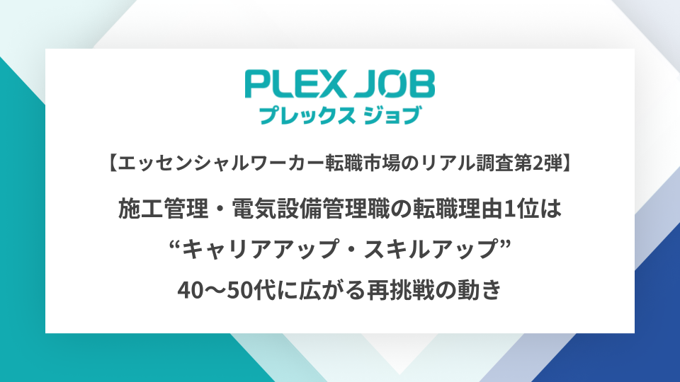 運送|建設|技術職の求人サイト「プレックスジョブ(https://www.plex-job.com/)」を運営する株式会社プレックス(本社:東京都中央区、代表取締役社長:黒﨑 俊、以下当社)は、プレックスジョブ経由で転職した1,620名(内訳:ドライバー職 1,421名施工、施工管理・電気設備管理職 199名)にアンケートを実施し、エッセンシャルワーカー転職市場の実態を調査・分析しました。第2弾では、建設‧インフラ分野で活躍する施工管理職‧電気設備管理職に焦点を当てます。