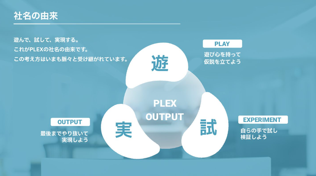 このように、個人起点の取り組みがいくつも生まれている背景には、プレックスという社名の由来でもある「PLAY AND EXPERIMENT(遊んで、試して、実現する)」という考え方があります。社員一人ひとりが遊び心を持って仮説を立て、試行錯誤を楽しみながら改善に取り組むことを歓迎する文化が根付いています。