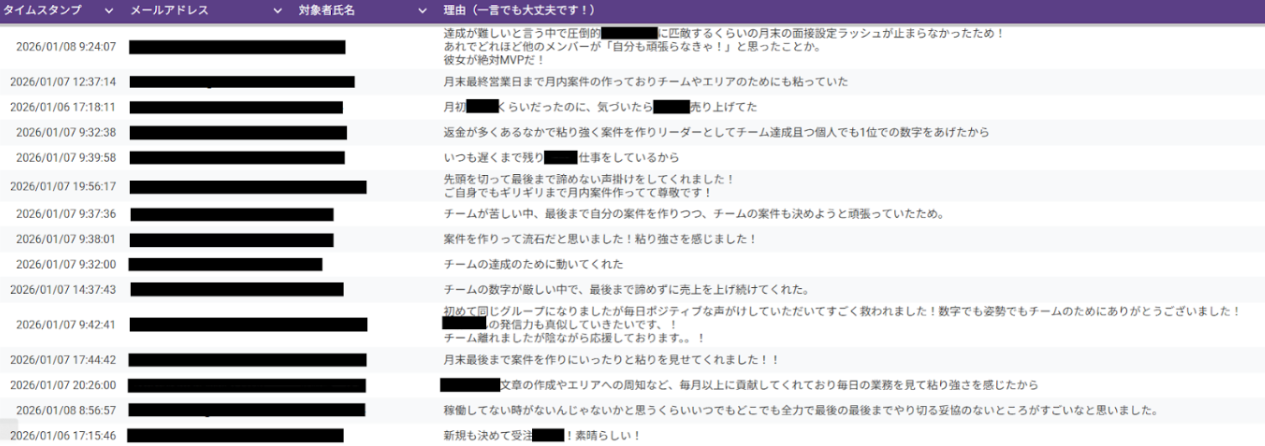 営業職において、売上以外の定性面での活躍や貢献を称える取り組みです。数字だけでは測れない影響力や周囲への働きかけも大切にし、全員で高みを目指すため、社員の発案で生まれました。毎月、メンバーの投票によって対象者を決定し、組織へのプラスの貢献を広く共有する場となっています。