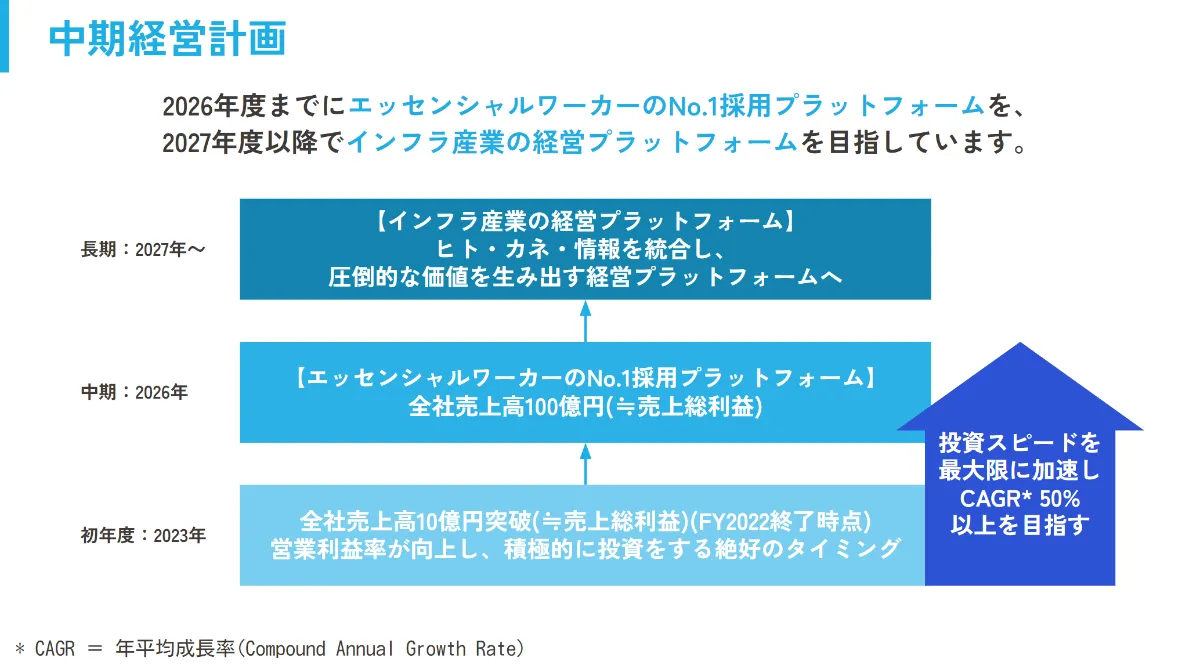 今後、企業は人に向き合った経営をしていかなければ、事業そのものが成り立たなくなる可能性があるので、当社がそうした課題に向き合いながら社会の基盤となる産業の採用を支援していくことは、非常に社会的価値が高いことだと考えています。まずはしっかりとインフラ産業を支えて、エッセンシャルワーカーのNo1プラットフォームとなり、祖業で売上高100億円を達成することが目標です。