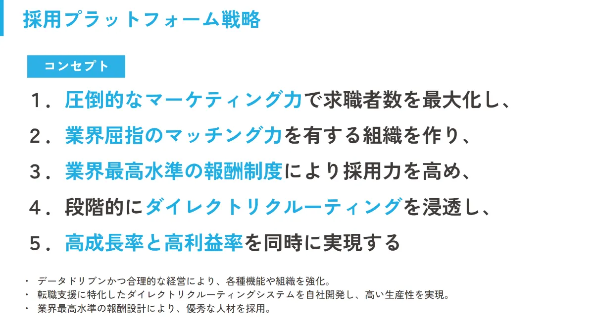 また、同じく3年目くらいに、人材紹介のマッチングの精度を高めて自動化していけるように、ダイレクトリクルーティングの仕組み作りを始めました。