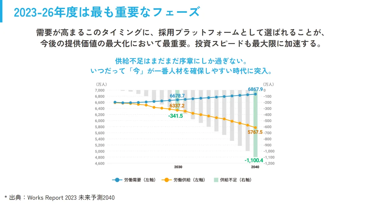 リクルートワークス研究所の「Works Report 2023」によると、2040年には1100万人の労働供給不足に陥るとの予測があり、労働需要が増加する一方で労働供給は減り続け、労働供給制約によるパラダイムシフトが始まると書かれています。