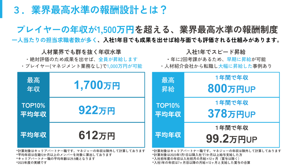 集客、営業、報酬制度の3つが効果的に組み合わさることで、効率的かつ無駄のない組織体制を築くことができています。その結果、業界最高水準の報酬を提供できますし、しっかりと還元することで離職率の抑制にもつながり、それによりさらなる成長や利益率の向上に結びつくという好循環が生まれています。マーケティング、セールス、経営企画が連動し、個人と組織のパフォーマンスを最大化できていることが、業界最高水準の報酬制度を実現できる大きな要因です。