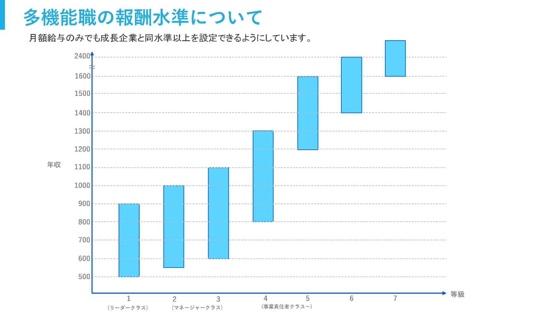 マネジメントできる組織の規模によって1等級から7等級まで等級を設けていて、1等級では3人、2等級では10人、3等級では30人、4等級以上では100人、300人、1,000人、3,000人規模のマネジメントを想定しています。年収レンジは1等級で500万円から900万円程度です。