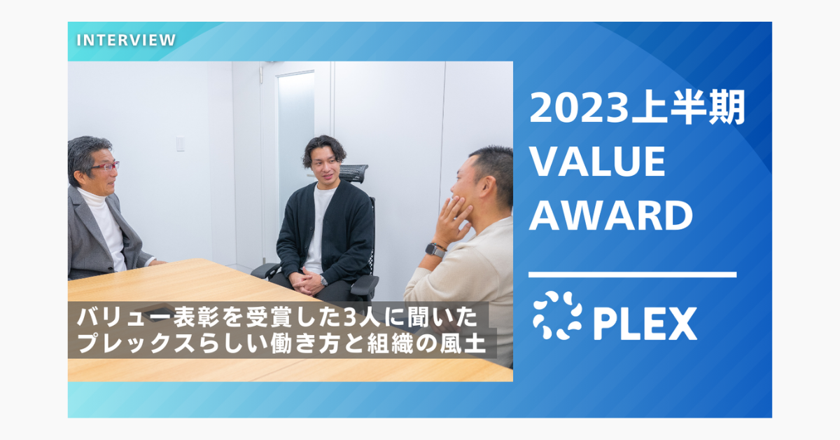 プレックスでは、「顧客・高み・一丸」という3つのバリューを掲げており、それぞれのバリューを体現するメンバーの表彰をおこないました。今回はバリュー表彰を受けた、T.H、H.K、M.Hの3人に、プレックスでの働き方や組織風土について話を聞きました